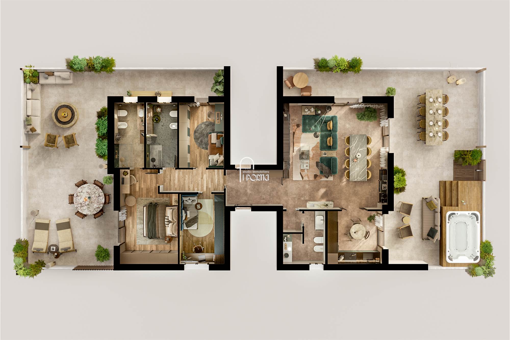 soluzione D5 ATTICO composto da soggiorno/pranzo con affaccio su ampia terrazza, cucina, bagno, lavanderia/ripostiglio,