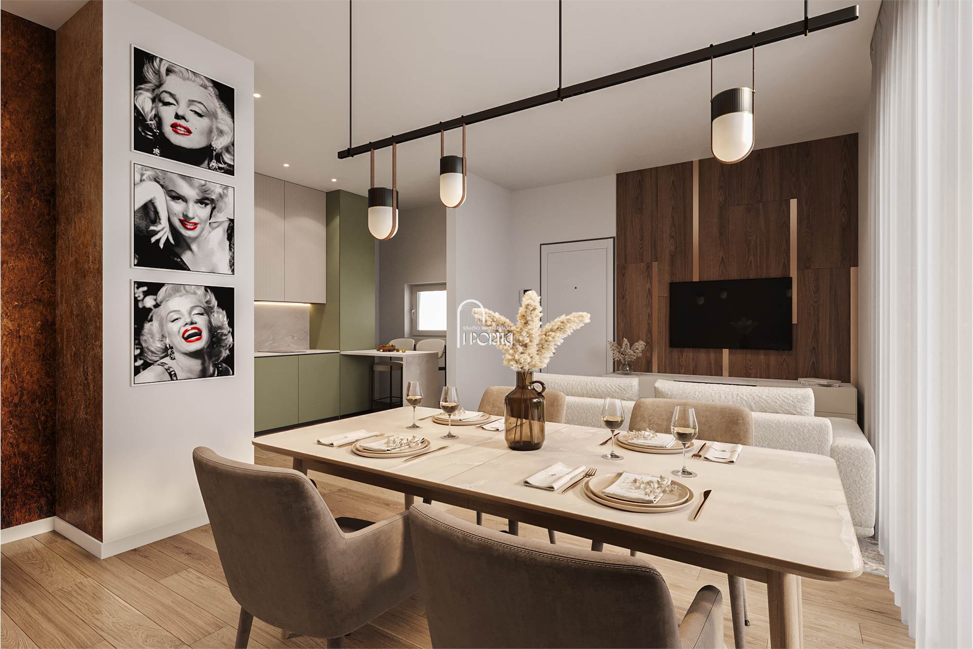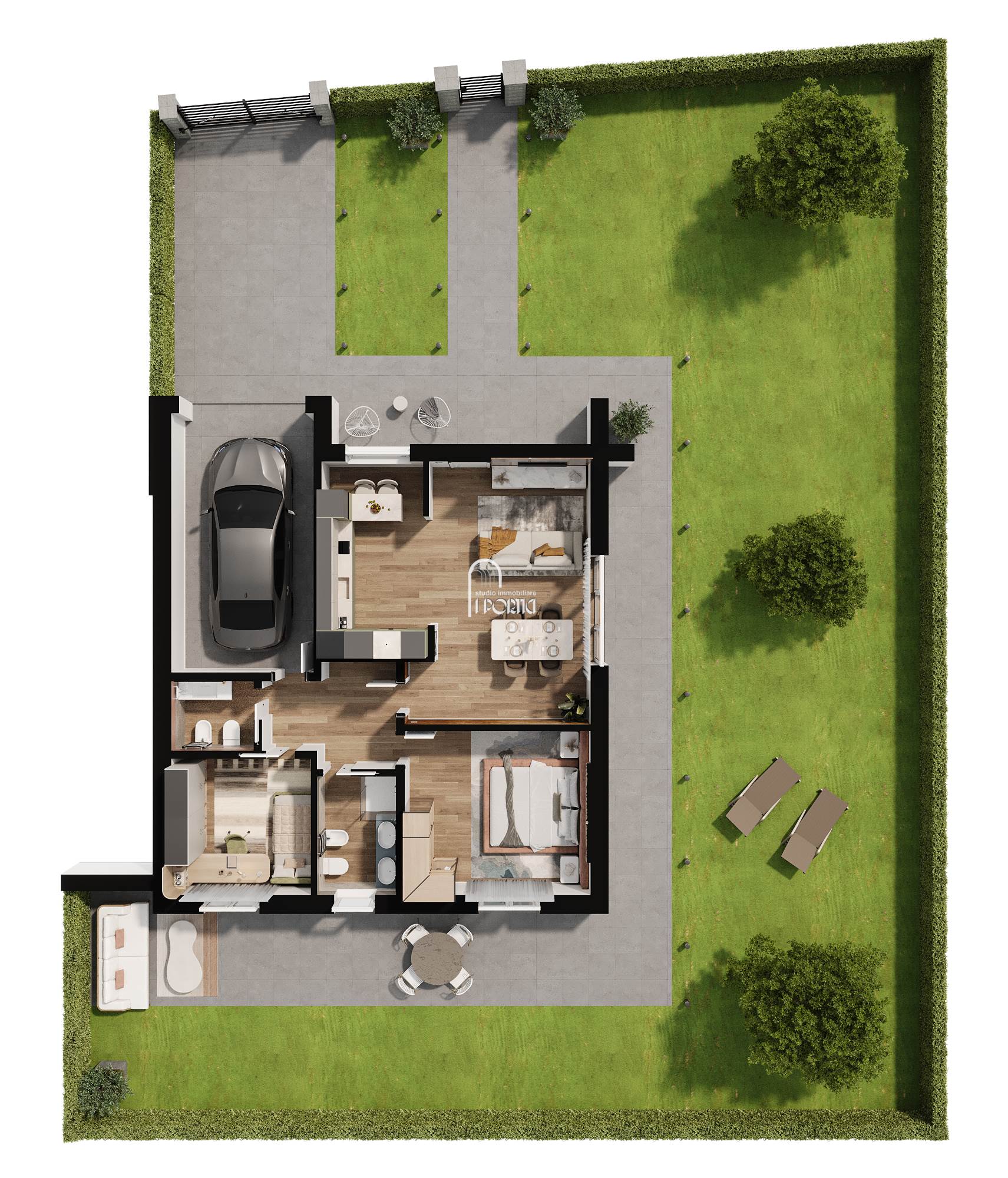 SOLUZIONE A6: maisonette composta da sala con cucina a vista e affaccio sul giardino, camera matrimoniale, camera singola, 2 bagni, autorimessa con accesso diretto all'abitazione e giardino esclusivo con ingresso indipendente
