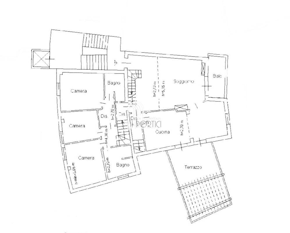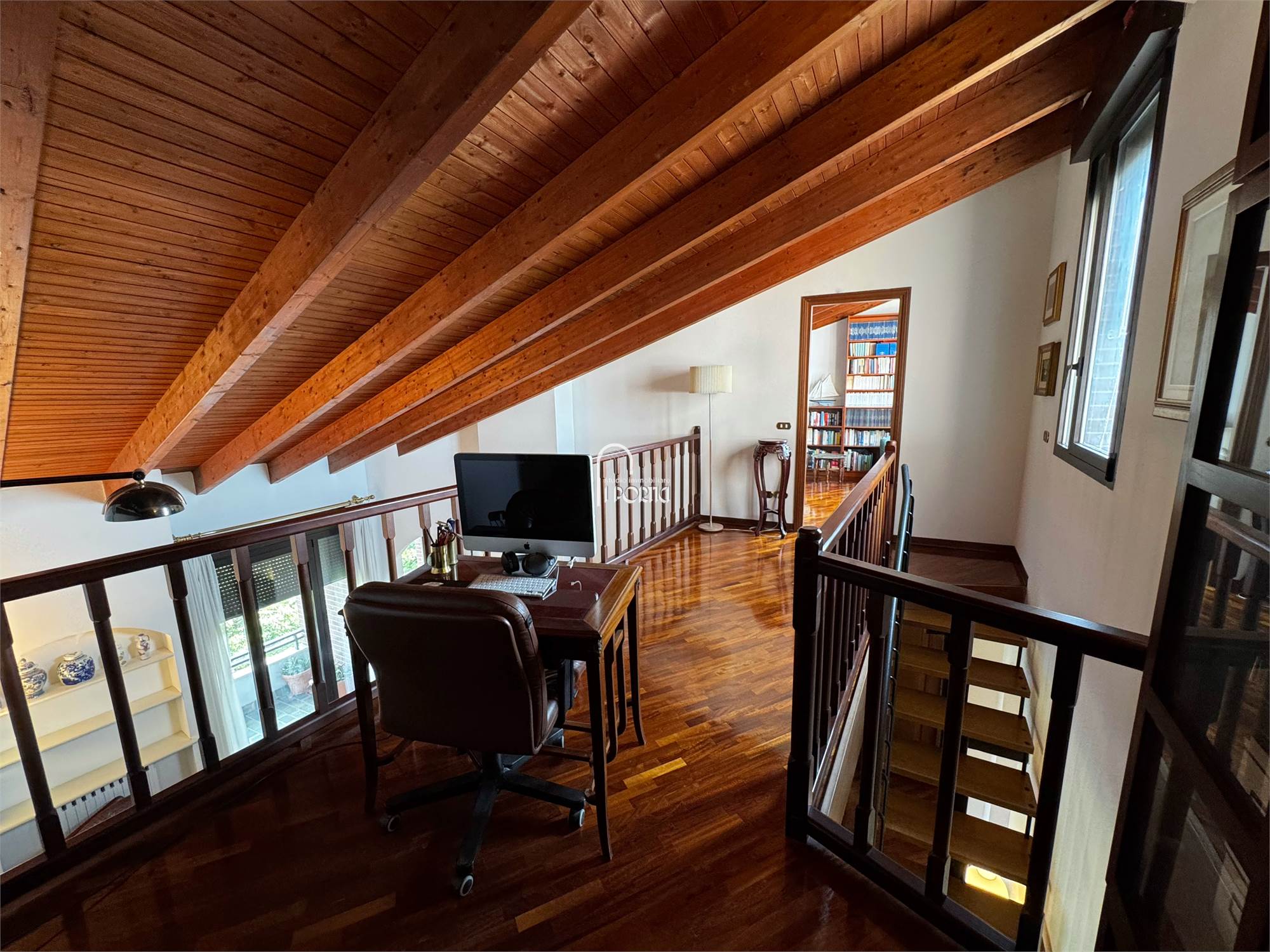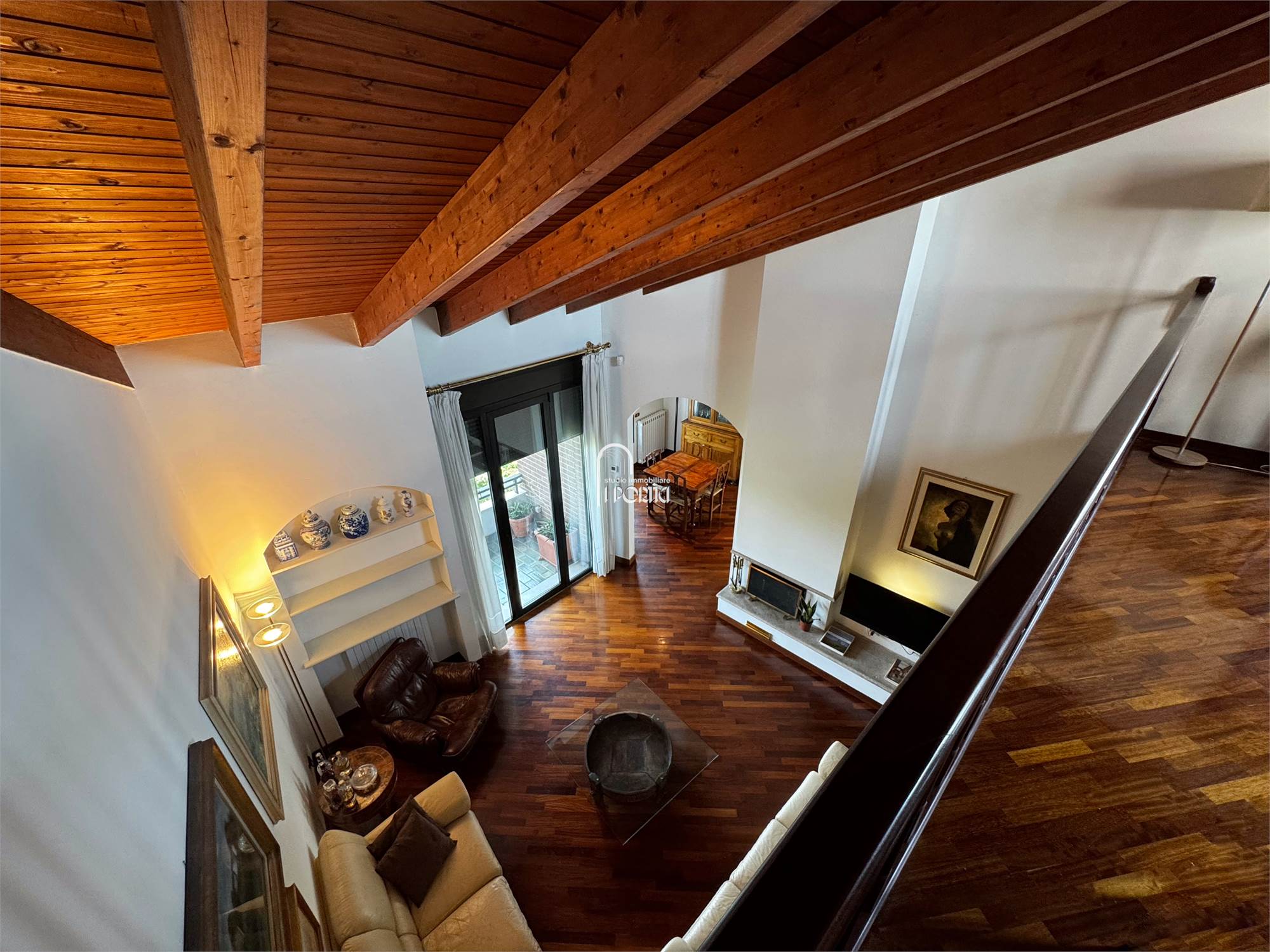 Ingresso, salone con camino, sala da pranzo, cucina abitabile, terrazzo, tre camere, due bagni, soppalco con studio-camera, lavanderia (possibile terzo bagno), ripostiglio, balcone. Molto luminoso e libero su tutti i 4 lati con totale privacy e perfetta esposizione.