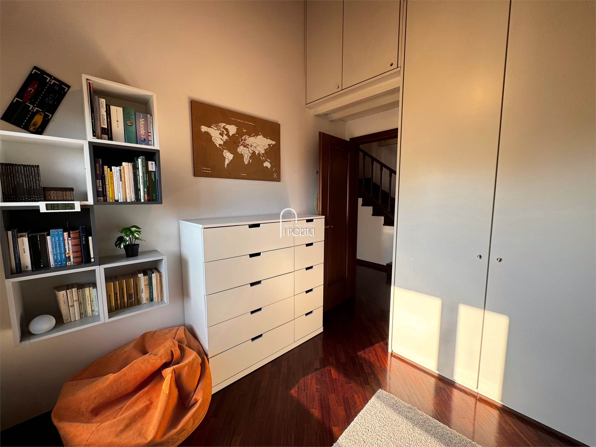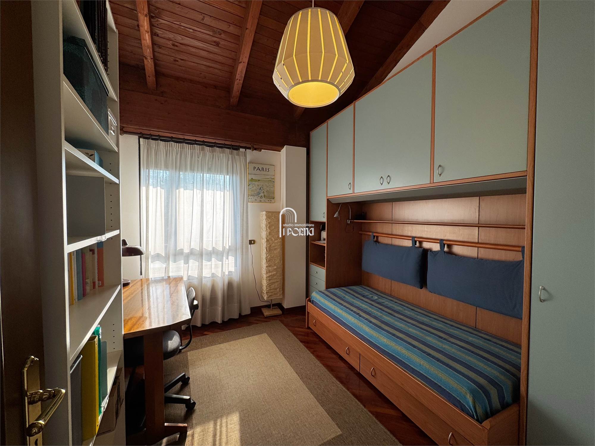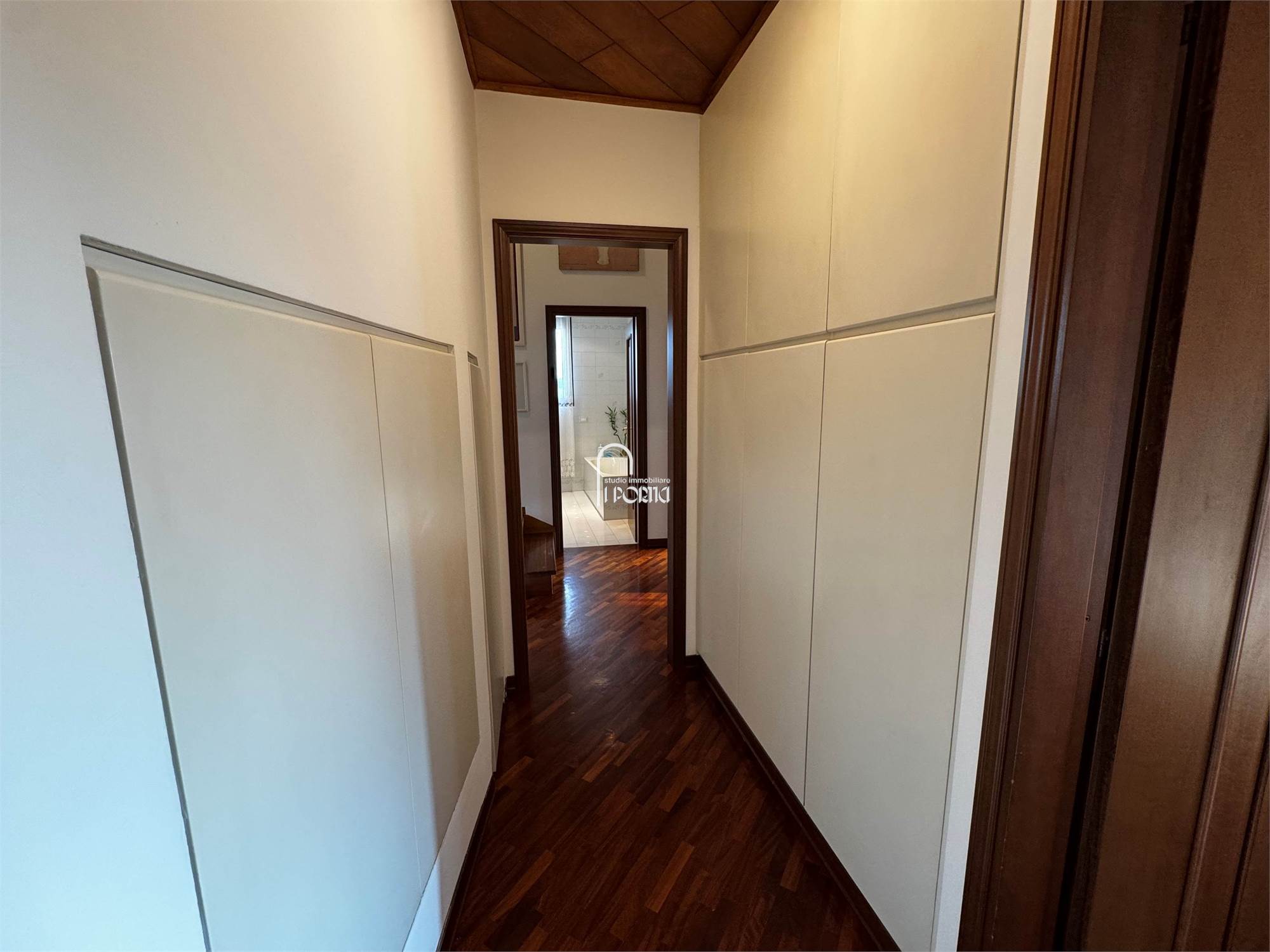 Ingresso, salone con camino, sala da pranzo, cucina abitabile, terrazzo, tre camere, due bagni, soppalco con studio-camera, lavanderia (possibile terzo bagno), ripostiglio, balcone. Molto luminoso e libero su tutti i 4 lati con totale privacy e perfetta esposizione.